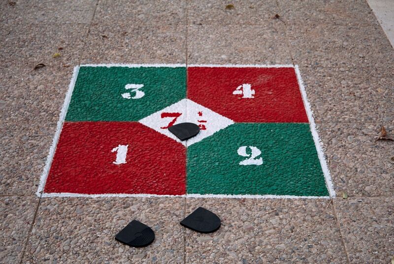 Players toss three heels onto a marked game board divided into numbered sections (1, 2, 3, 4 and the central 7 and a half zone). You can win instantly by landing inside the 7 and a half space — or cleverly combine scores like 3 + 4 + half to hit the target total. Go over 7 and a half and you are out!
